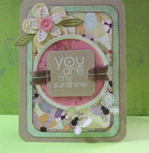 The paper I used is from Basic Grey’s Kioshi line (Camelia for the background, sticker elements for the butterflies, leaves and circle border, and a bloomer for the flower.)