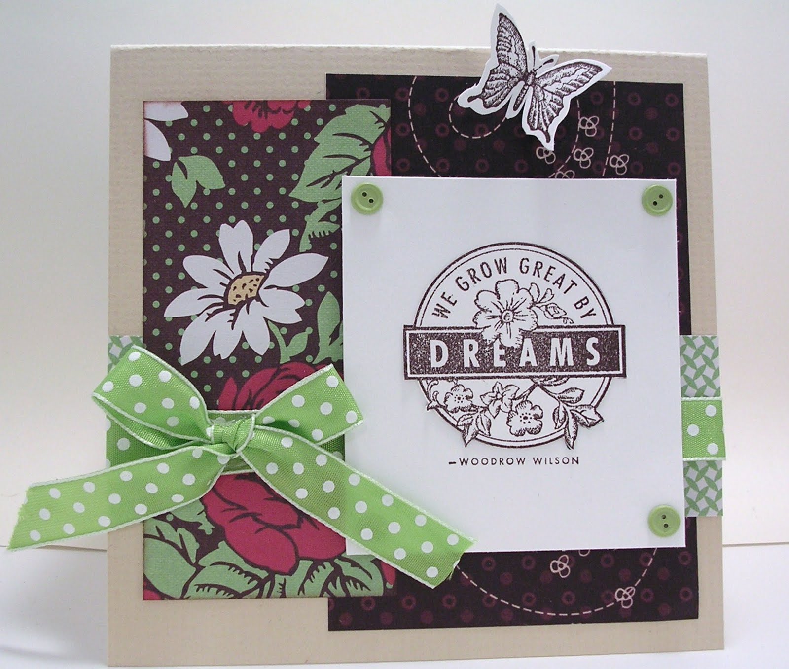 My card uses mini Jenni Bowlin papers and also a piece of paper from Prima’s Blooming Retro collection, Creative Impressions ribbon, Making Memories button brads, and two stamps from Stampin’ Up!’s “Dreams du Jour” stamp set. I originally tried to color in the stamped image, but decided that I liked it better without the extra color, so I stamped another and glued it on top of the colored one.