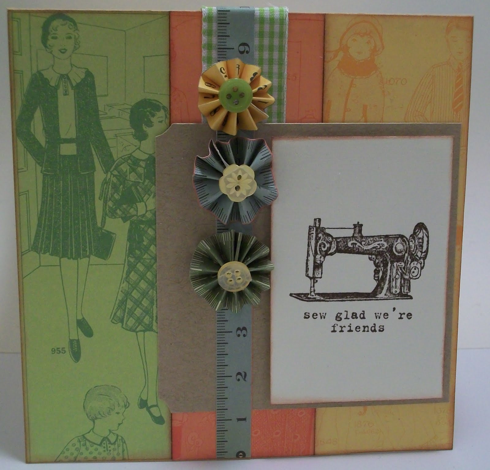 I fan-folded the flowers from strips of the measuring tape paper. After fan-folding each flower, I glued the ends together and stuck them to the card with a large glue dot. Then, I glue-dotted a button to the flower’s center. I saw the original flower idea in a recent edition of Paper Crafts magazine.