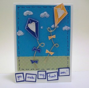 And here’s my card! The blues made me think of sky colors…but I didn’t want to make a sun out of the yellow, so I came up with kites.
