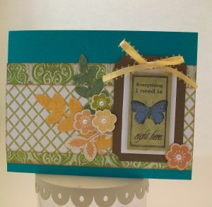 The cardstock is Bermuda Bay and Soft Suede from Stampin’ Up!, the papers are from 3 Bugs in a Rug and Pink Paislee. The cardstock accent is from Melody Ross, and the die-cut flowers and leaves are from K & Company. The ribbon is from Martha Stewart and the adhesive pearls are from Prima.