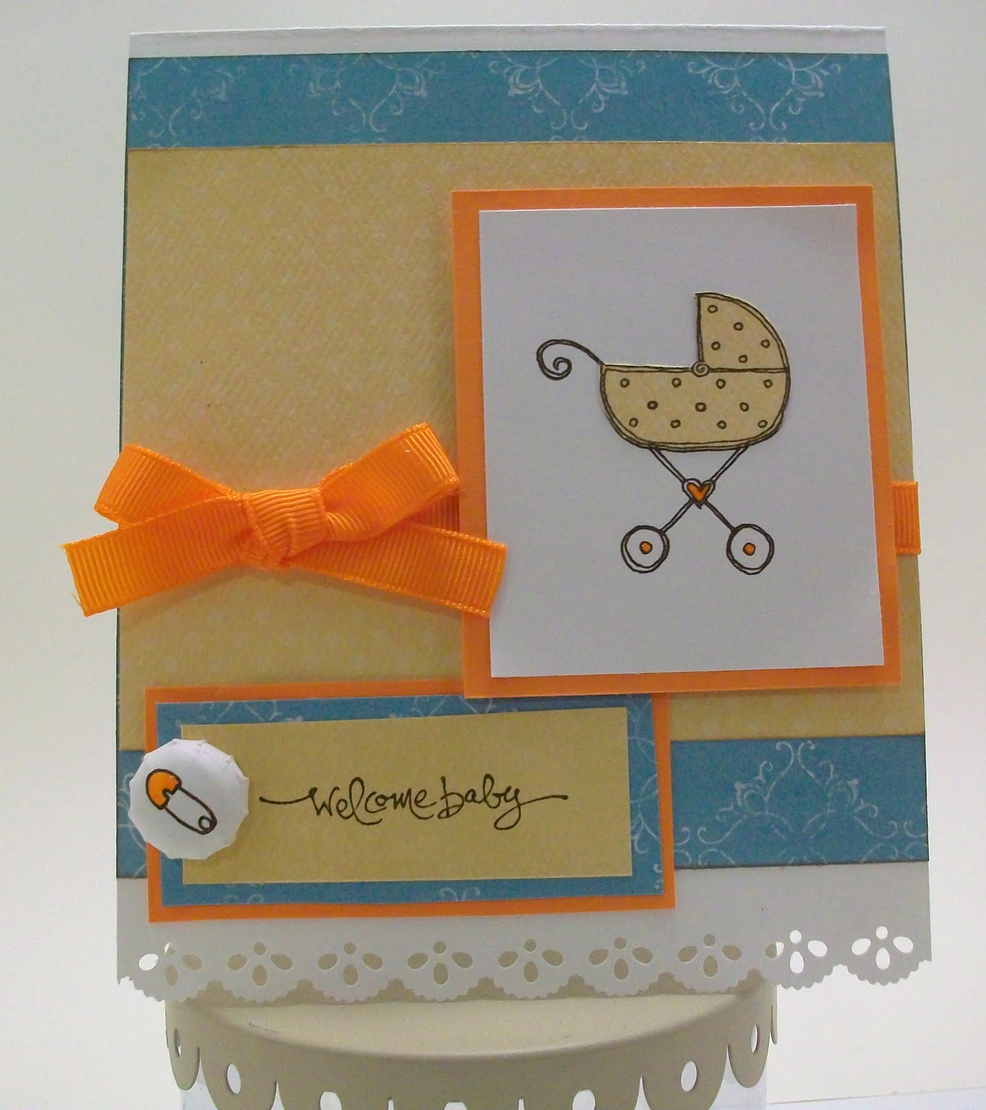 The carriage stamp is from SU’s “Fun and Fast Notes” collection. I made my own brad with the i-Top, using a diaper pin stamp from the “Short & Sweet” set. I also used the matching sentiment from the same set.