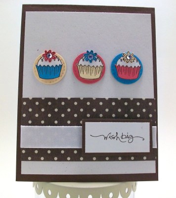 I used SU cardstock in the challenge colors, and also Natural White. The cupcakes and sentiment are stamped with Chocolate Chip ink. The cupcake stamps are from Elzybells Art Stamps, and the sentiment (and flower stamp) comes from SU’s “Short & Sweet” stamp set.