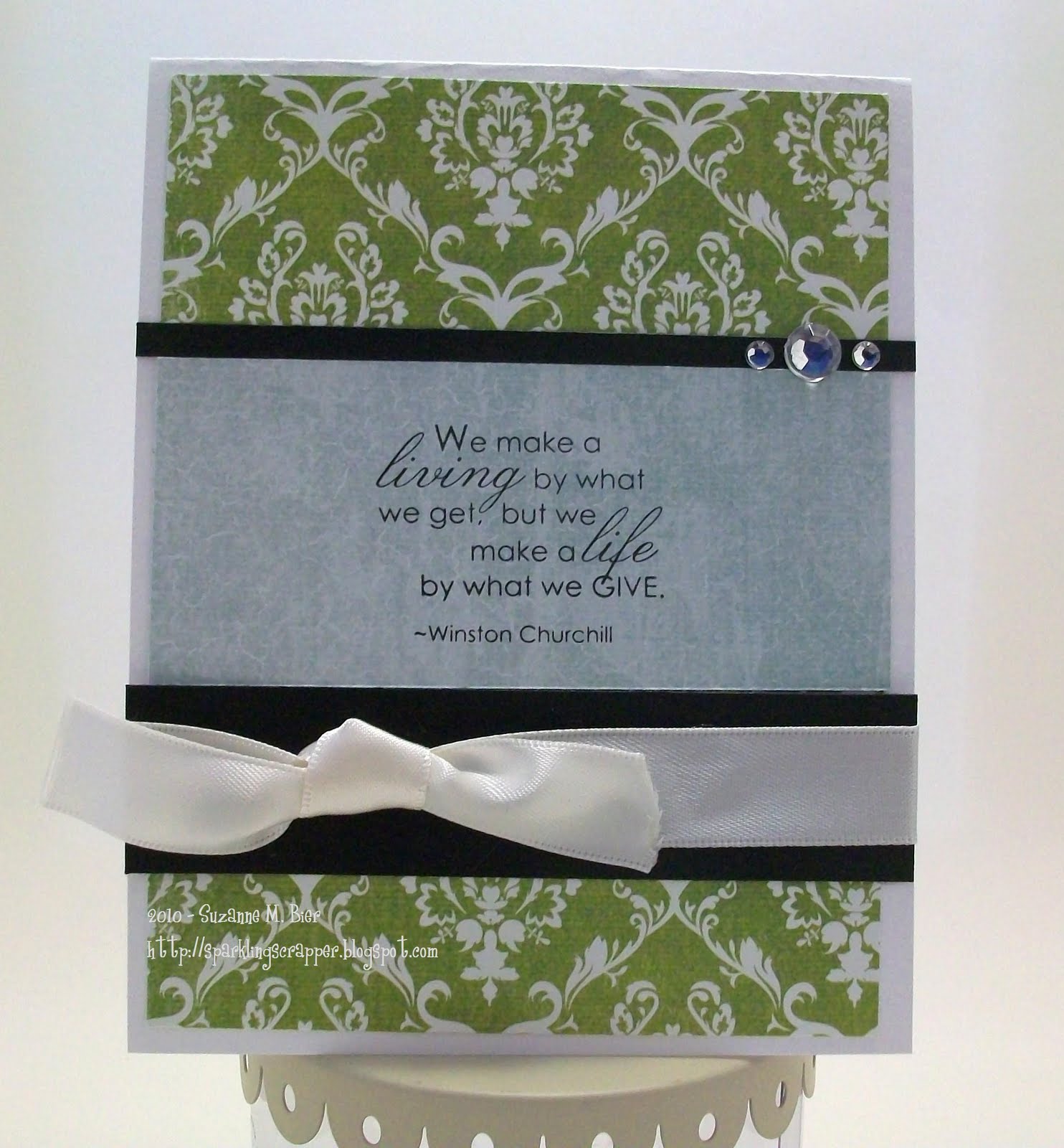 The background paper is from Pink Paislee’s 365 Degrees collection. I used SU cardstock in Natural White and Basic Black. The sentiment is from SU’s “Occasional Quotes” set, which is a new Level 3 Hostess Set. I stamped the sentiment in Basic Black ink and finished off the card with some adhesive rhinestones and satin ribbon.