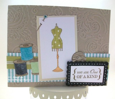 For my card, I used kraft as the card base and embossed it with a Tim Holtz folder in the Big Shot. The sentiment and dressform stamps are by Stampin’ Up! (from the “One of a Kind” and “Chic Boutique” sets) The thread spool, button and pin stamps are by Hero Arts. I used paper by My Mind’s Eye, American Crafts and SU Cardstock to complete the card.