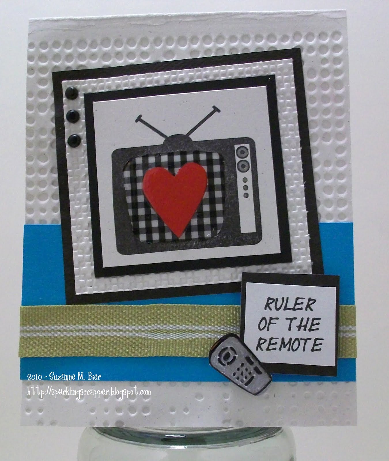 I drew the remote on white cardstock with a fine-tipped felt pen, and then colored it in with a silver gel pen. I used a scrap of black gingham paper for the TV screen after cutting the screen portion out with a craft knife. I cut the heart out of Real Red cardstock and sealed the screen with Glossy Accents.