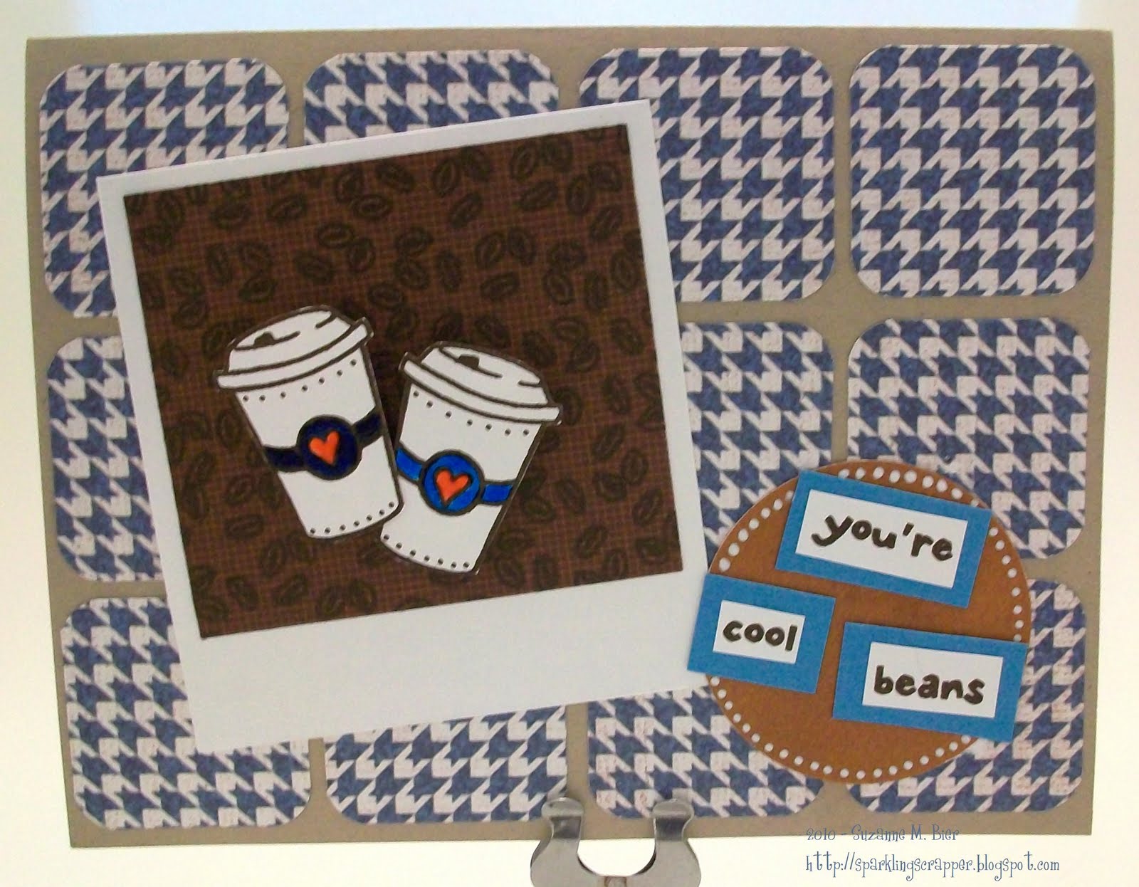 For my card, I borrowed the blue/white/brown color scheme and decided to make a masculine-ish card featuring some of my favorite coffee-themed stamps by Elzybells!