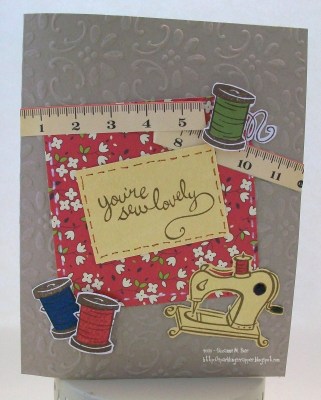 The card base is SU kraft cardstock. The stamped images and sentiment are by Lawn Fawn (Sew Lovely set). The patterned paper is by Jillibean Soup. I embossed the card base with the Big Shot using a SU-exclusive embossing folder. The measuring tape is from Cosmo Cricket’s Material Girl collection.