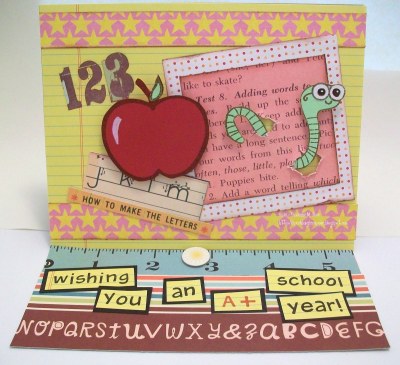 I don’t have any kids yet, so I don’t have a lot of school-related stamps. I used an Imaginisce clear worm stamp and an apple stamp (it had a smiley face on it, but I masked that out). I used Lawn Fawn’s “Harold’s ABCs” set to stamp the sentiment.