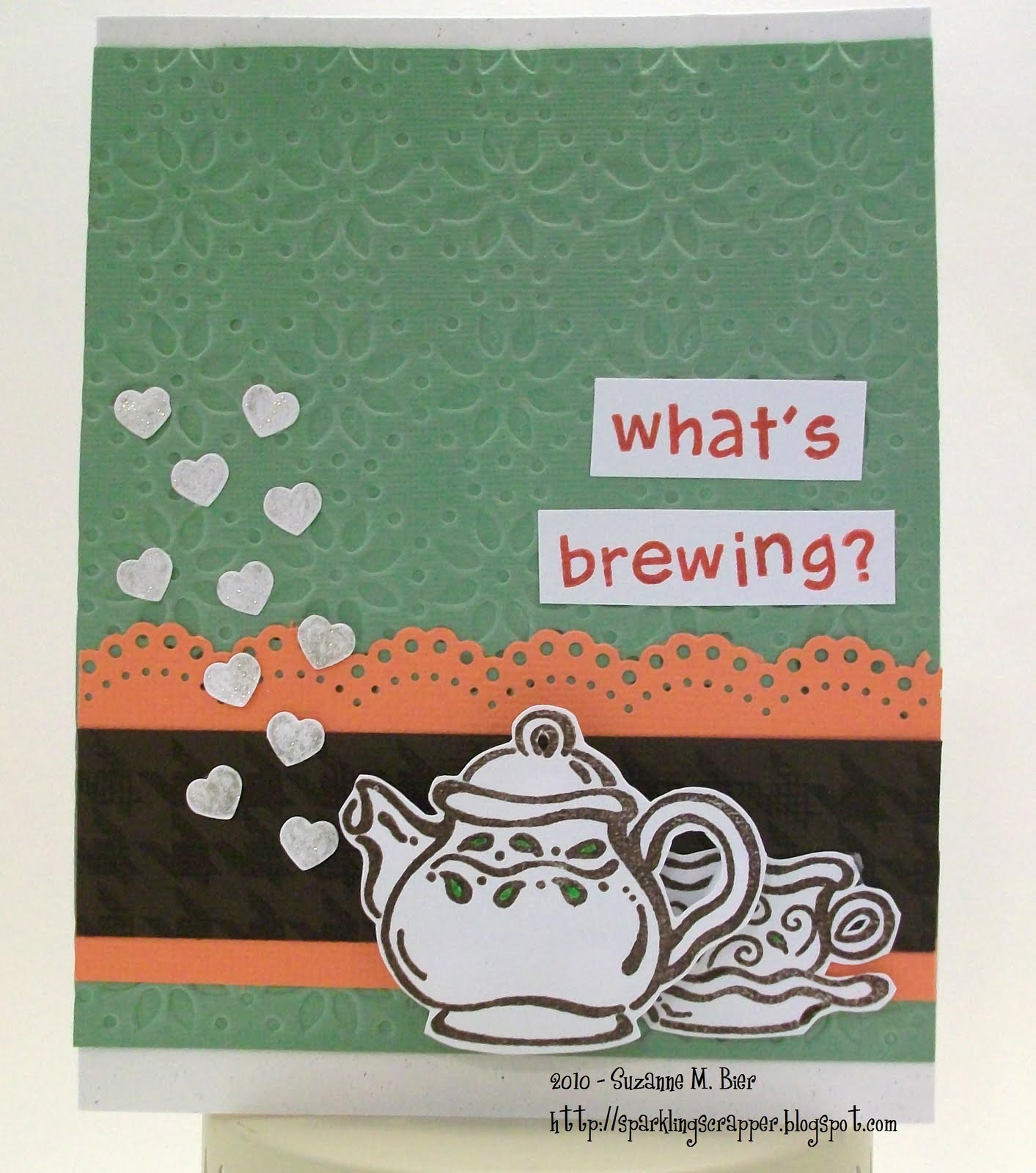 Supplies: Stamps (Close to My Heart – teapot/cup, Lawn Fawn – alphabet, Technique Tuesday – houndstooth), Ink (Stampin’ Up!), Border Punch (Martha Stewart Crafts), Embossing Folder (Sizzix), Cardstock (Stampin’ Up!, Bazzill), Other (heart punch, glitter pen)