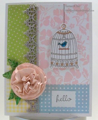 I used SU natural white cardstock for the base, and papers by The Girls’ Paperie for the background. The bird cage and sentiment are also by Stampin’ Up! I used a piece of Maya Road lace for the trim and Chocolate Chip ink and dimensional glaze and glitter pens to color in the details on the birdcage.