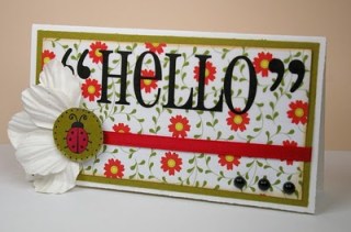 The paper I used is from Sassafras’ Nerdy Bird collection. I used an SRM sticker for the sentiment (I LOVE these). The flower was made by stacking two felt flowers and securing them with a custom brad. I used four coordinating glitter brads and some sheer red ribbon to complete the card.