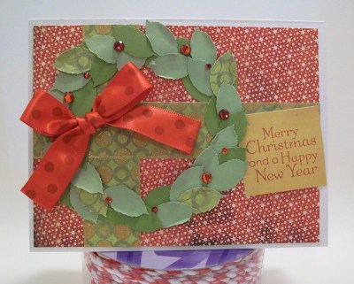To make the wreath, I punched out lots of leaves in a few shades of green. Then I drew a circle on the card where the wreath would be placed, and layered my leaf punches around the circle. I glued rhinestones around the wreath and finished the card with a bow and a sentiment made to look like a tag.