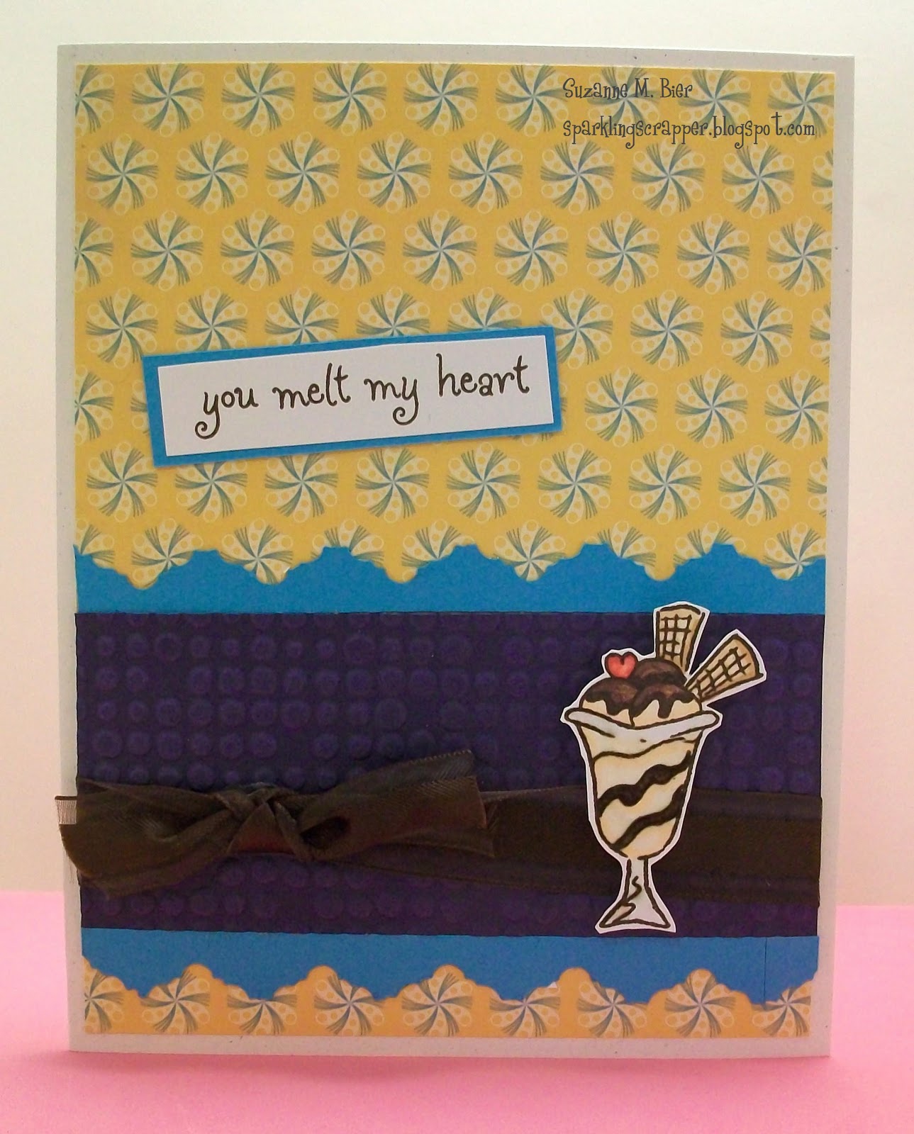 I used some paper from Cosmo Cricket’s Togetherness collection for the background, stamped the image and sentiment in Chocolate Chip ink, and used pieces of Concord Crush and Tempting Turquoise for the border strips. My other supplies are Copic markers (used to color in the image), ribbon, and clear stamps from Elzybells Art Stamps.