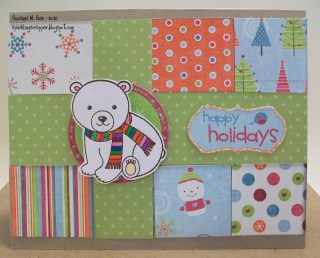 and here’s my card! I bought these papers last year at the Seattle CKC, but haven’t used them yet! They’re from My Mind’s Eye’s Colorful Christmas collection! The polar bear stamp is by Imaginisce…I thought it would pair well with these papers!