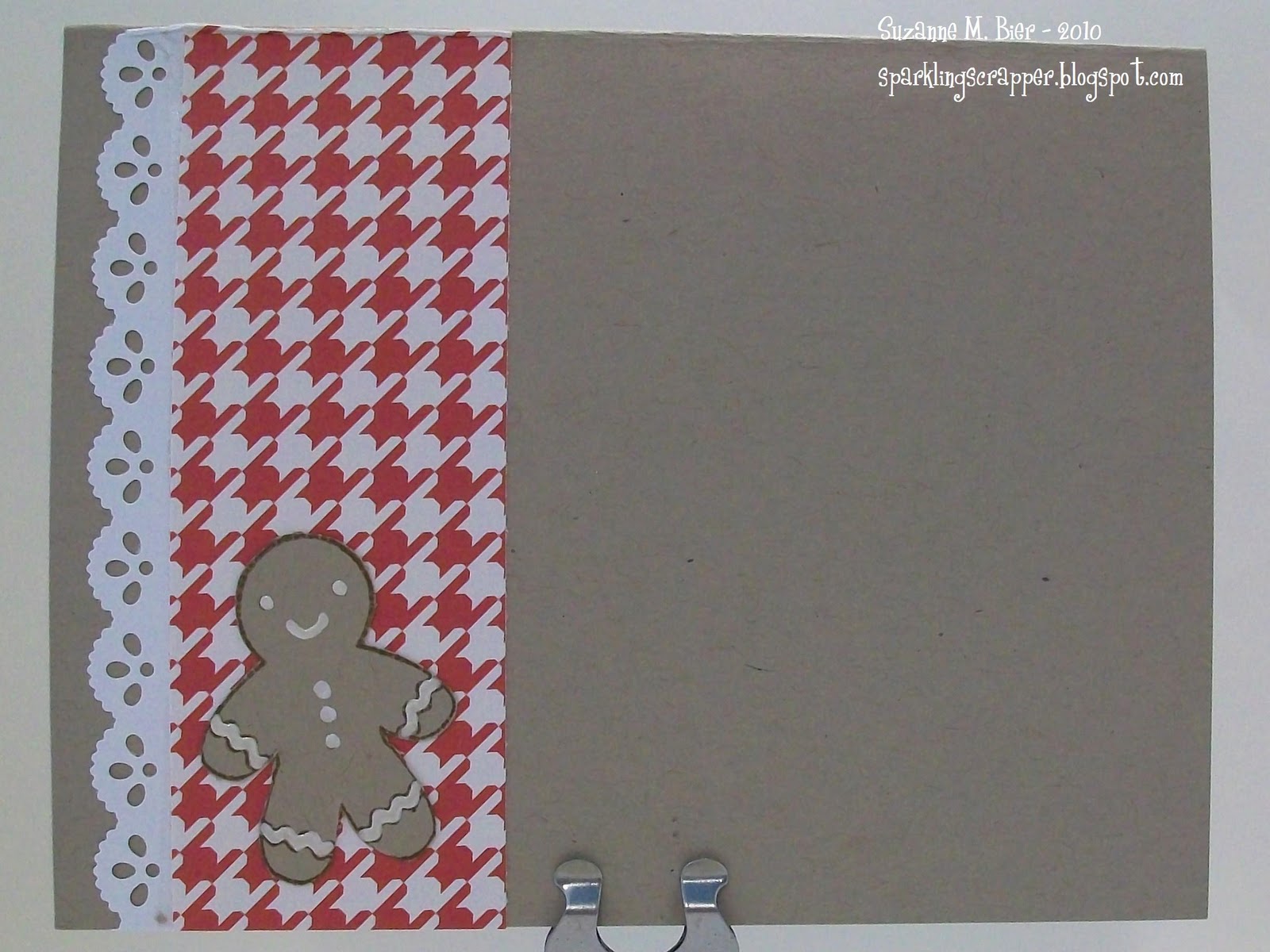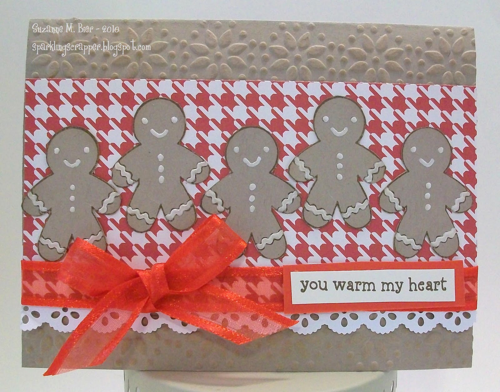 Supplies: Stamps: Imaginisce (images) and Elzybells (sentiment), Ink (Stampin’ Up Soft Suede), Cardstock: Stampin’ Up!, Paper: Jillibean Soup, Other: Martha Stewart Border Punch, white opaque dimensional pen, ribbon.