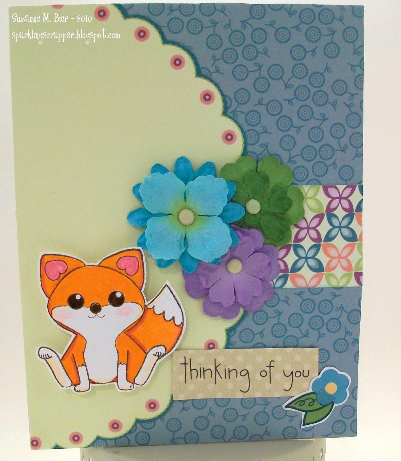 The flowers are from my stash, and the rub-on sentiment I used is by Pebbles. I colored the fox with colored pencils and markers.