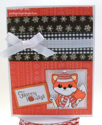 The stamps are from Imaginisce. I pieced the hat and scarf from some other Imaginisce stamps that I have. The cardstock that I embossed is from Stampin’ Up! Everything was stamped in SU Chocolate Chip. I used some papers from SEI and Making Memories to work in the brown, black and white.