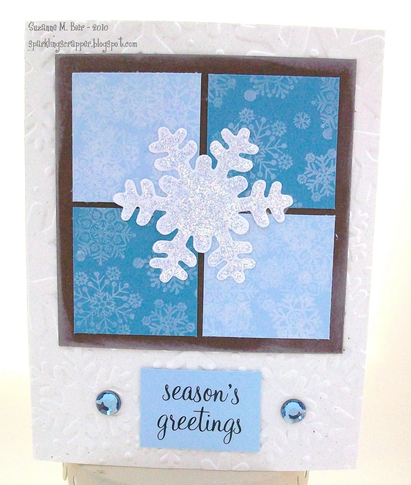 I used some Technique Tuesday stamps to make the snowflake backgrounds on the cardstock, and embossed some Natural White cardstock for the base. After assembling the mosaic of squares, I die-cut a snowflake and added Stickles to give it some sparkle! To finish the card, I added some adhesive gems and a rub-on sentiment on matching cardstock.