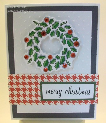 I used the Basic Gray cardstock as a mat/frame for my card, then layered an embossed rectangle of Whisper White. The wreath was cut out and I used foam squares for dimension. After applying the sentiment to white cardstock, I matted it on Always Artichoke and then on top of a strip of Jillibean Soup patterned paper.