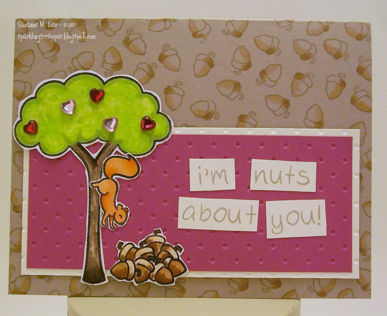 I used Lawn Fawn’s “Critters in the Burbs” set for this one…the background is hand-stamped and colored using the acorn stamp from the set. I used the same acorn to mask a stamped pile at the bottom of the tree. I used “Jessie’s ABC’s” to create the custom sentiment.