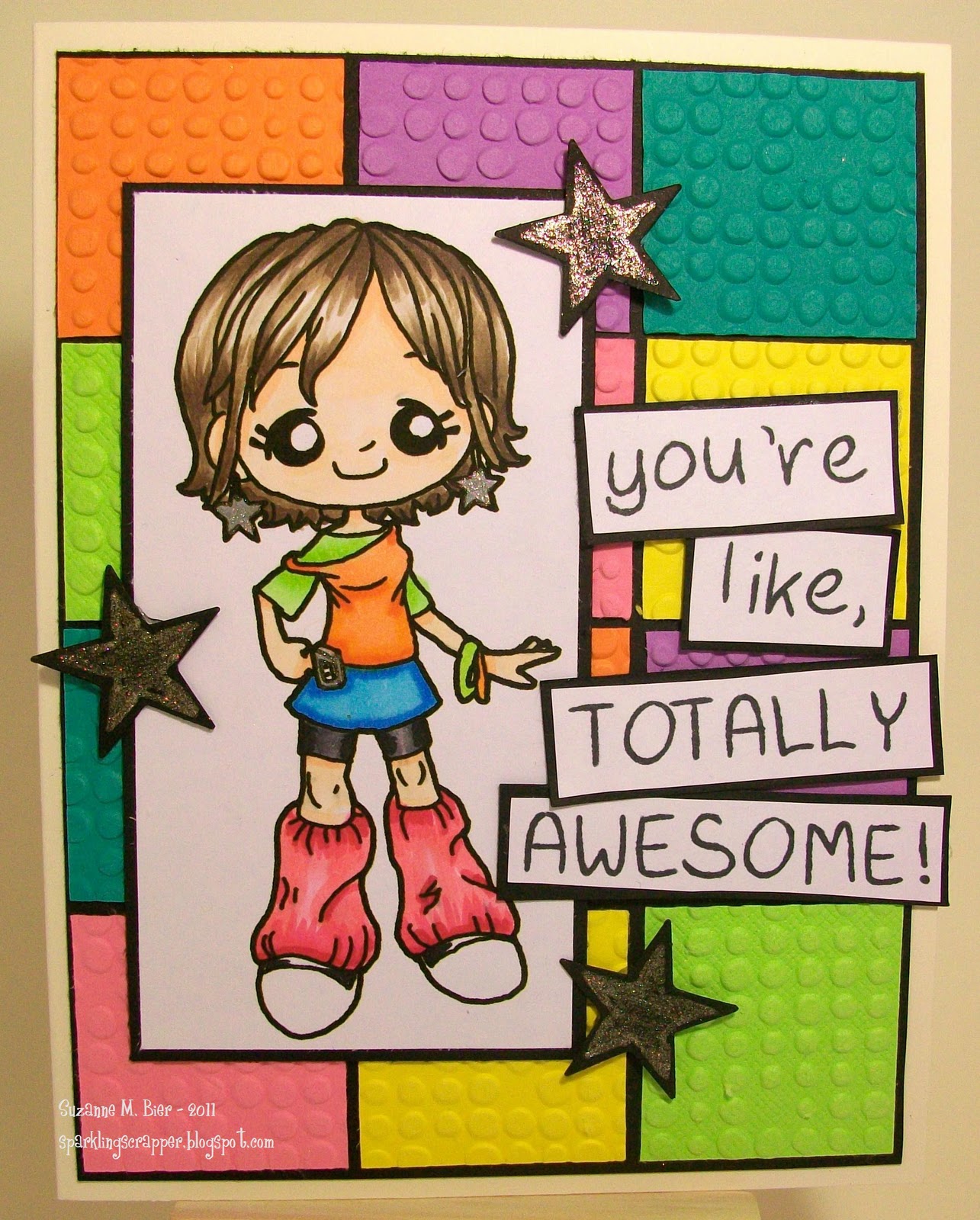 The sentiment was assembled with a set of letter stamps, and I consulted my California-born husband to make sure I got the “Valley-Girl” wording right!