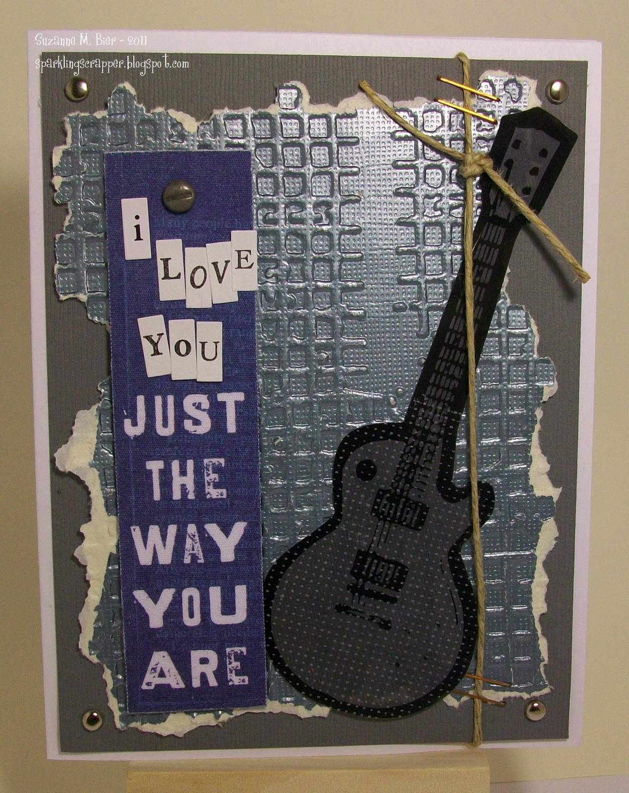 Supplies: cardstock (Core’dinations, Stampin’ Up!), accents (Little Yellow Bicycle), embossing folder (Sizzix), alpha stickers (Making Memories), brads, twine, staples.