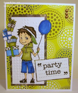Because the challenge was based on the Marjolaine collection, I used papers from the mini pad for my card, which also features Sparkle Creations Rubber Stamps’ “Birthday Josh”: