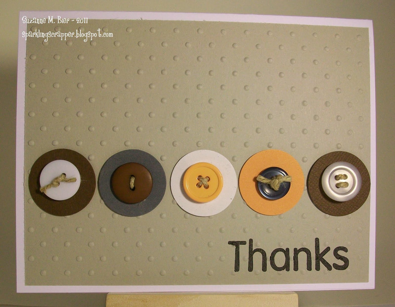 All of the Stampin’ Up! cardstocks I used are in the challenge colors, and the buttons are from my stash. I used twine to “sew” the buttons and a Sizzix embossing folder. The sentiment is from My Little Shoebox.