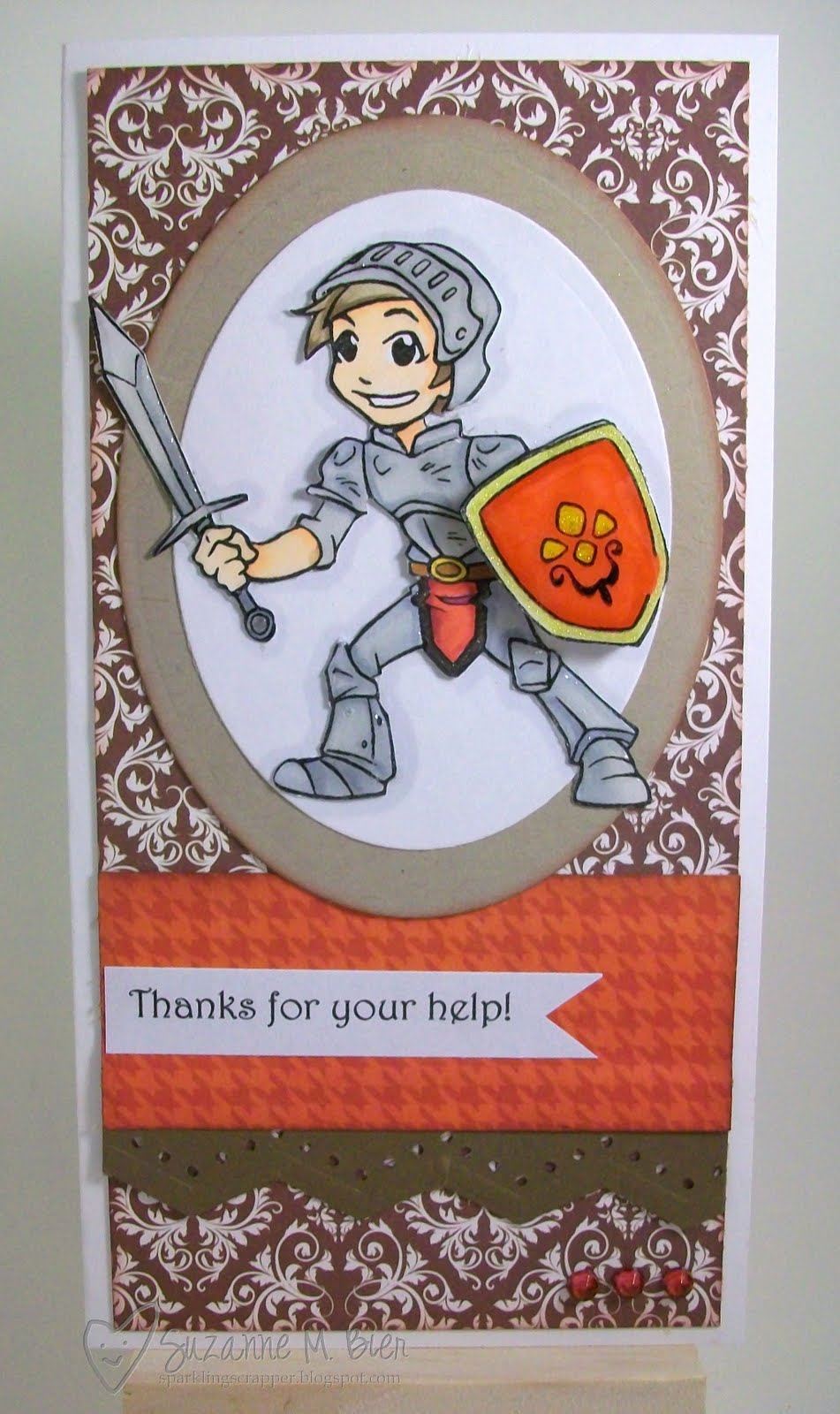 I didn’t like the way his shield came out when I first colored it, so I stamped another, colored it and used foam squares to place it on top of the other one. I also used Glossy Accents on his armor, sword and shield.