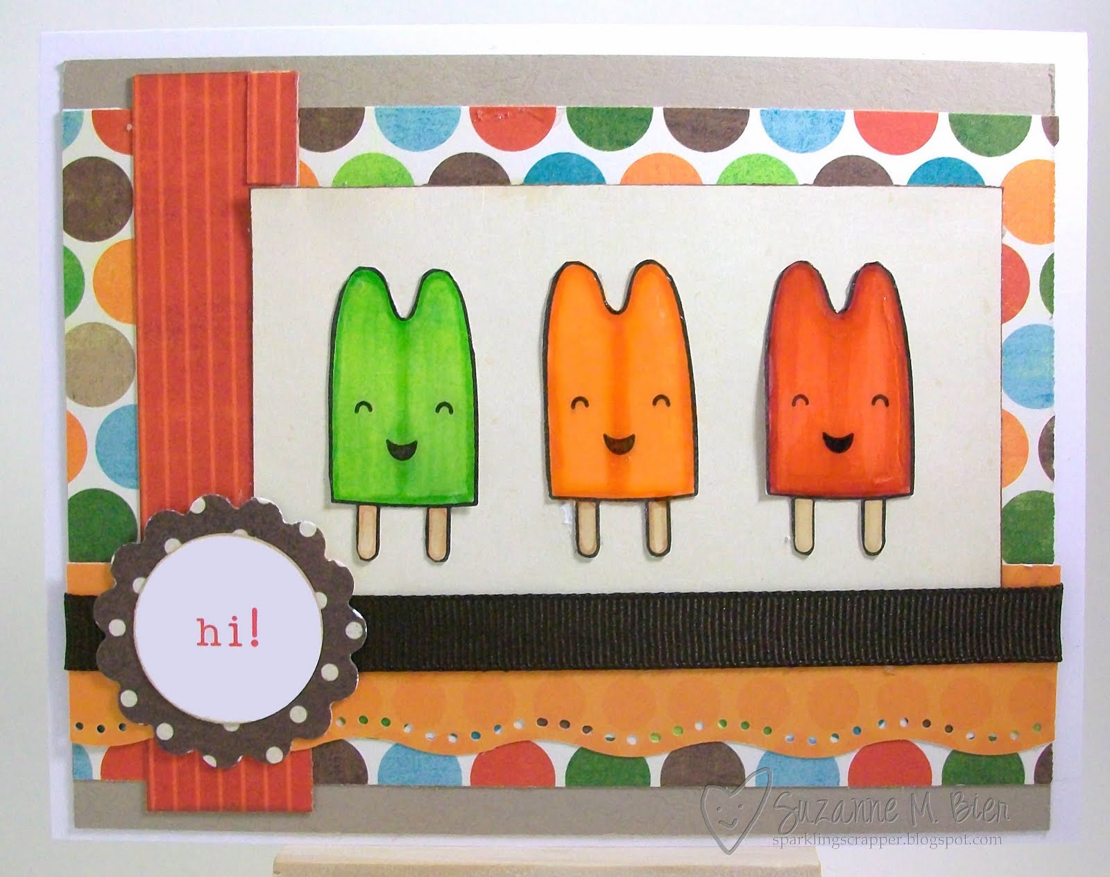 and here’s what I came up with! I’ve wanted to use these stamps for some time…I’m a sucker for food with faces! I colored these on Saturday night and thought they’d work great with the patterned paper and this sketch!