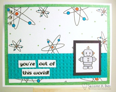 Supplies: robot stamp (DeNami Designs), typed sentiment, background paper made with self-drawn digital elements, cardstock (Stampin’ Up!), embossing folder (Sizzix), Copic markers, green paper (Crate Paper).