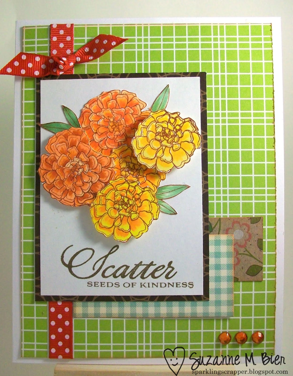 Supplies: image and sentiment stamps (Papertrey Ink, Year of Flowers), paper (Jillibean Soup, and scraps from American Crafts and October Afternoon), ribbon, adhesive gems, Copic markers and foam squares.