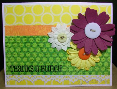 Supplies: sentiment sticker (SRM Stickers), card base, border punch (Fiskars), buttons, twine, paper flowers, Rich Razzleberry cardstock (Stampin’ Up!), yellow paper (Cosmo Cricket DeLovely), word stamp (Technique Tuesday), ink (Stampin’ Up!), orange paper (Basic Grey Life of the Party).
