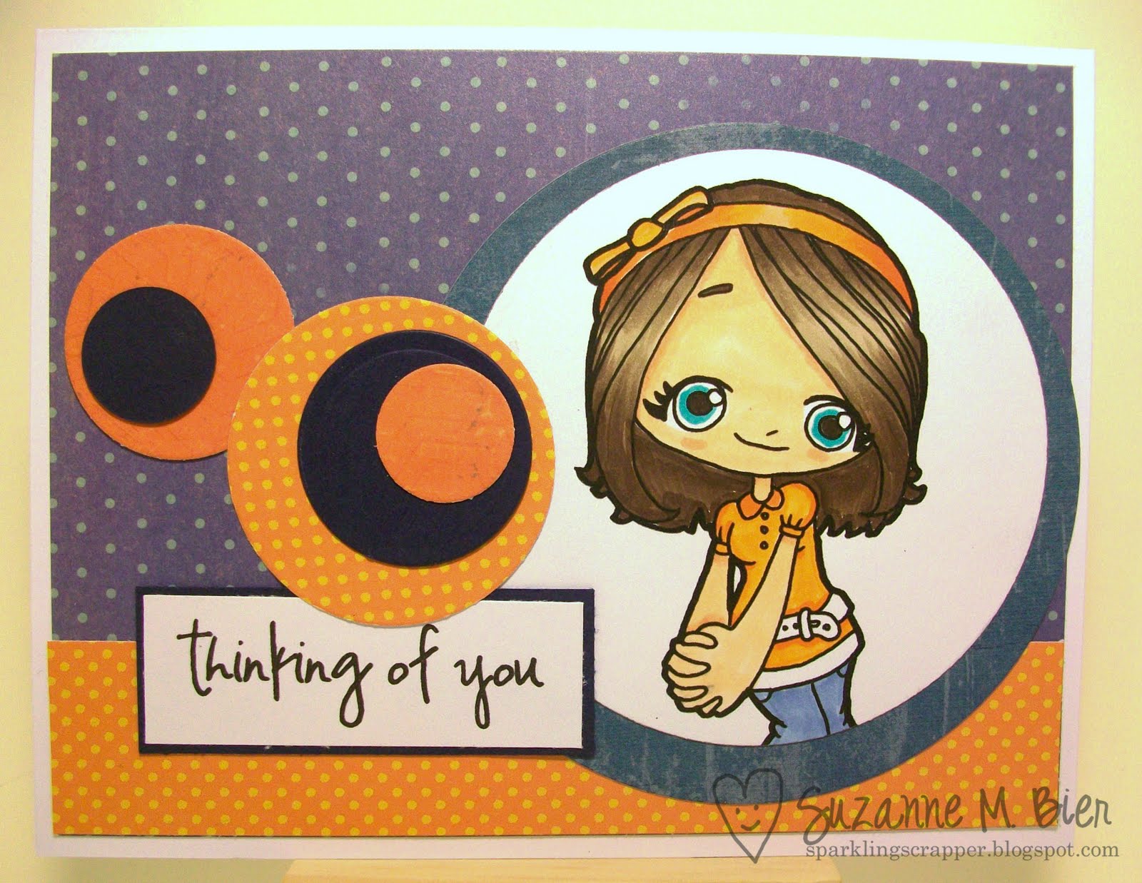 I chose orange and blue (with a little red-orange and blue-green mixed in) for my card, which also features SOG’s Shy Mae digi! (Lucky for me, hair and skin don’t count toward the two colors, since I tend to color many of my images as brunettes!)
