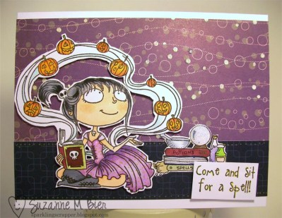Here’s my card! I rotated the sketch to the side. Instead of a large title, I used a strip of navy patterned paper. I arranged the image of the magical items and the sentiment in the place of the two rectangles on the sketch, and put my main image in the larger open area.