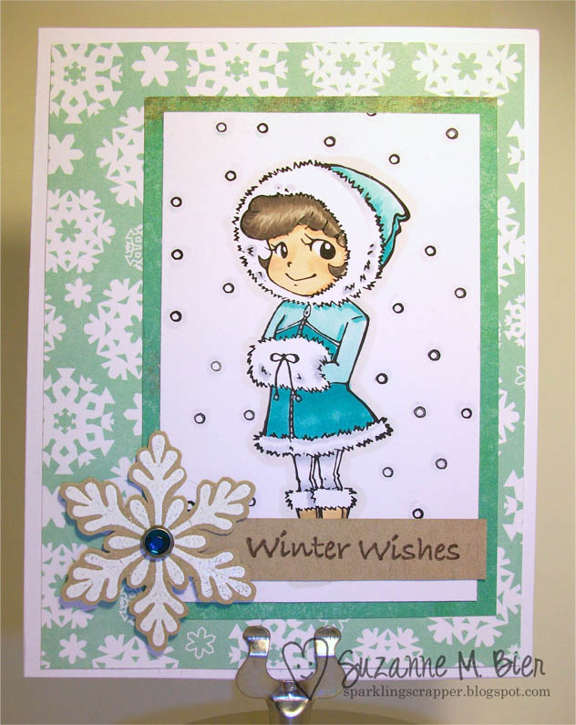 | Supplies: image stamp (Snowbunny Lucy – Sparkle Creations Rubber Stamps), sentiment stamp (Imaginisce), snowflake stamp (aMuse Studio), ink (VersaMark, Tsukineko Brilliance – Graphite Black, Stampin’ Up! – Chocolate Chip), embossing powder, gem brad, Copic markers, patterned paper (My Mind’s Eye), card base. |
