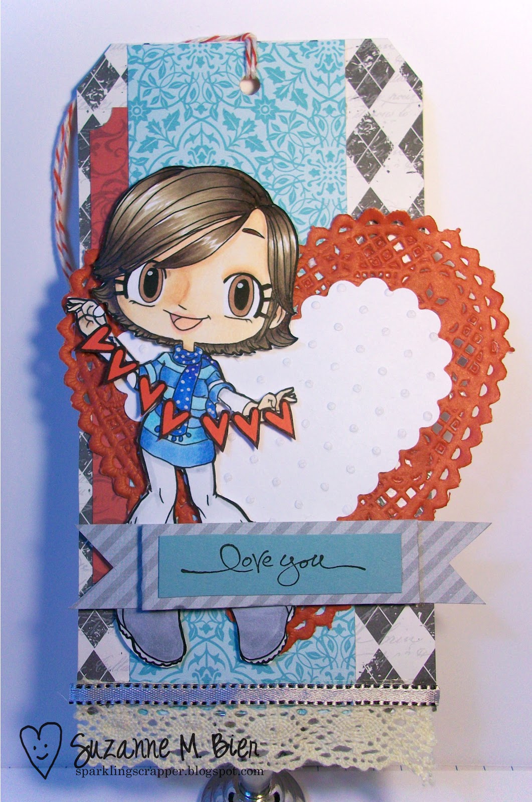 For my entry, I made a tag featuring SOG’s Bright Lights Kaylee digi. She’s normally a Christmas holiday image, but I repurposed her for Valentine’s Day! Instead of her usual string of lights, she’s stringing up a garland of hearts! I love how she came together!