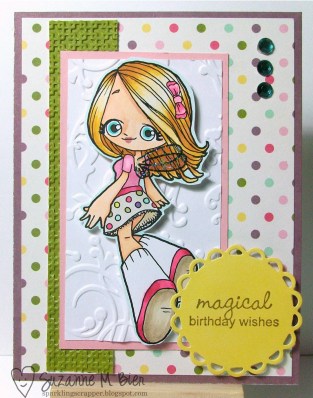 | Supplies: digital stamp (Some Odd Girl – Fairy Fly Away Mae), sentiment stamp (C.C. Designs/AmyR Stamps – Magical Wishes Sentiments), patterned paper (Echo Park – Springtime), embossing folder (Sizzix), cardstock (Stampin’ UP!), die (Spellbinders Lacey Circles), Copic markers, foam tape, adhesive rhinestones, card base, Stickles. |