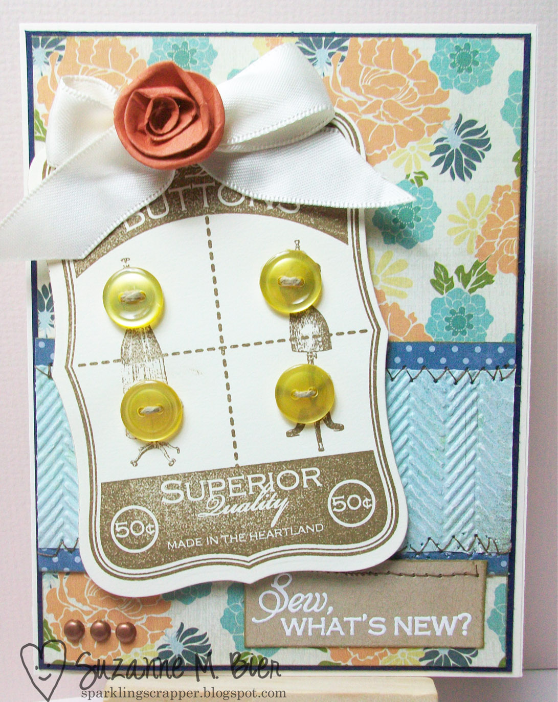 | Supplies: patterned paper (Indie Chic Citron – My Mind’s Eye; Dots & Stripes – Echo Park), ink (SU Soft Suede, VersaMark watermark), stamps (Sew Lovely – The Craft’s Meow), dies (Spellbinders Labels 8, Memory Box Small Pinwheel Posie), white embossing powder, embossing folder (Cuttlebug), sewing machine, buttons, jute twine, mini metal brads, ribbon, foam tape. |
