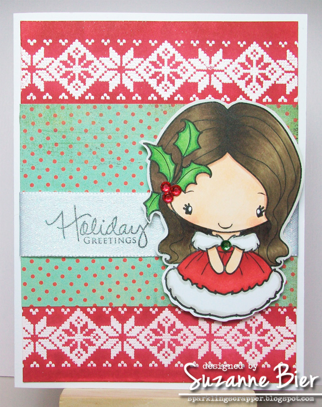 | supplies: image stamps (Surfing Oliver, Elf Oliver (hat) – Sparkle Creations Rubber Stamps), paper (Crate Paper, Basic Grey), Copic markers, adhesive rhinestones, typed sentiment, sewing machine, foam tape. |