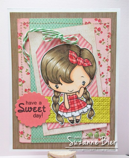 | Supplies: patterned paper (Crate Paper – Pretty Party mini pad), pink striped paper (My Mind’s Eye), image stamp (The Greeting Farm – Do Si Do Anya), sentiment stamp (Some Odd Girl – Tiny Baker Tia), card stock (Stampin’ UP – Summer Starfruit), embossing folder (Sizzix/Stampin UP), glitter brads, ink (Brilliance Graphite Black, brown cat’s eye pigment), Spellbinders scalloped circle die, Copic markers (skin – E00, E02, E11, R02; hair – E42, E43, E44, E47; dress/bow – R14, R21, R22, R24, R46; shoes – E49; shadows – W1, W2, W4), sewing machine, eyelet, twine (Whisker Graphics). |