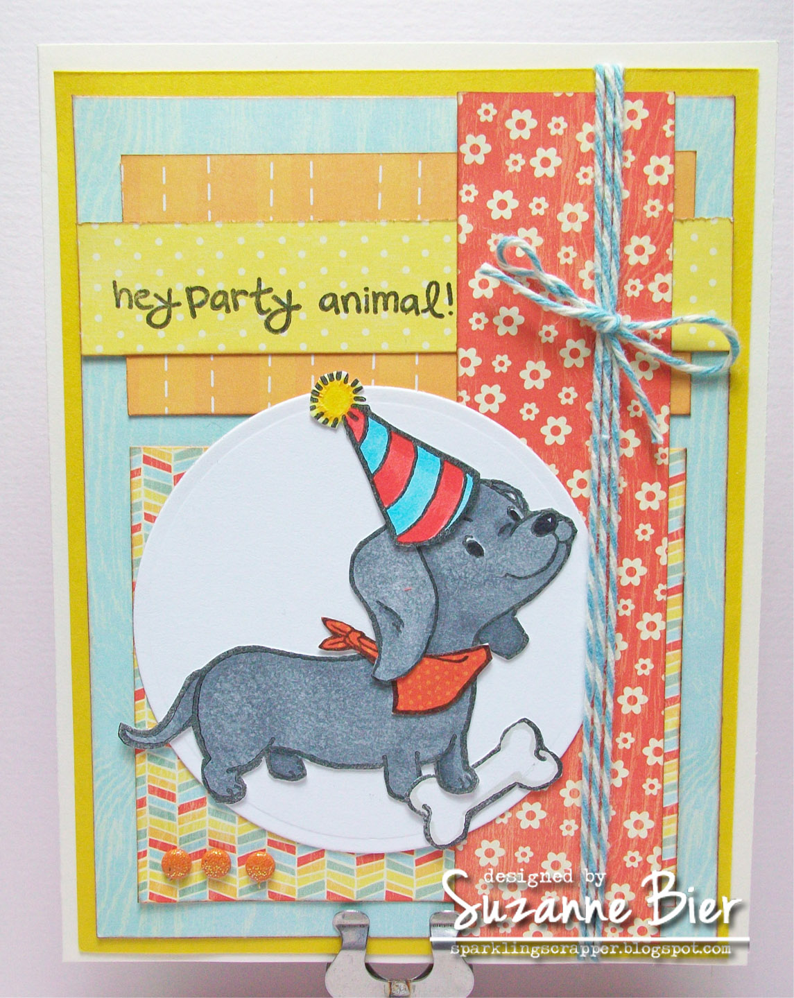 I colored this super cute dachshund (that’s part of the “Preppy Pups” set by Some Odd Girl Stamps) to match my sweet dog, Midnight. The papers are from My Mind’s Eye’s “On the Sunny Side” collection (except for the orange paper, which is from Echo Park):