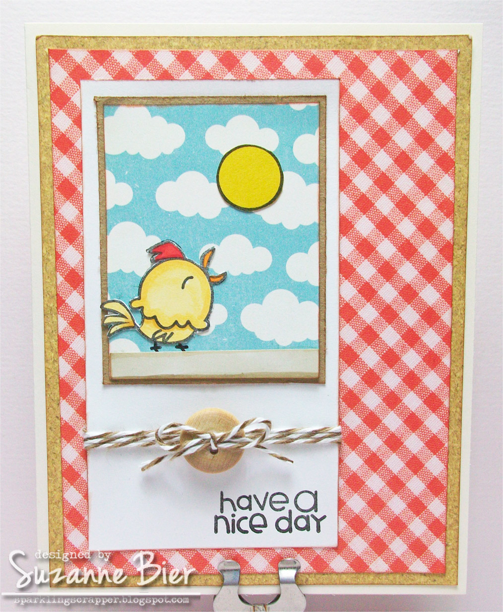 | supplies: patterned paper (My Mind’s Eye), image and sentiment stamps (Paper Smooches – “Wake Up” set), twine (Trendy Twine), wood button, cork paper (Echo Park), kraft card stock, Copic markers. |