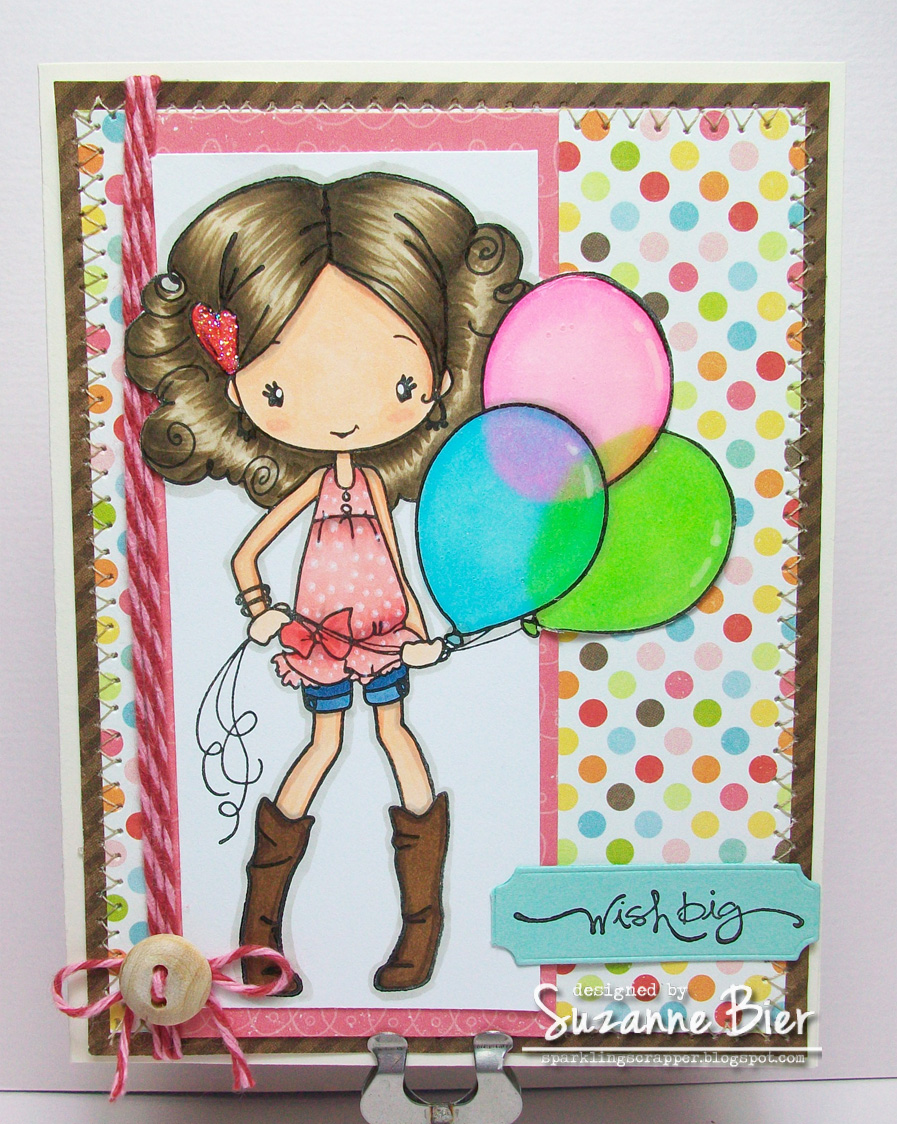 | Supplies: image stamp (The Greeting Farm – “Anya Lifts“), sentiment stamp (Stampin’ Up), twine (Trendy Twine), patterned paper (Echo Park), Copic markers, opaque white marker, Brilliance Graphite Black ink, wood button, label die (Memory Box), sewing machine, card base, Stickles, Ranger Glossy Accents. |