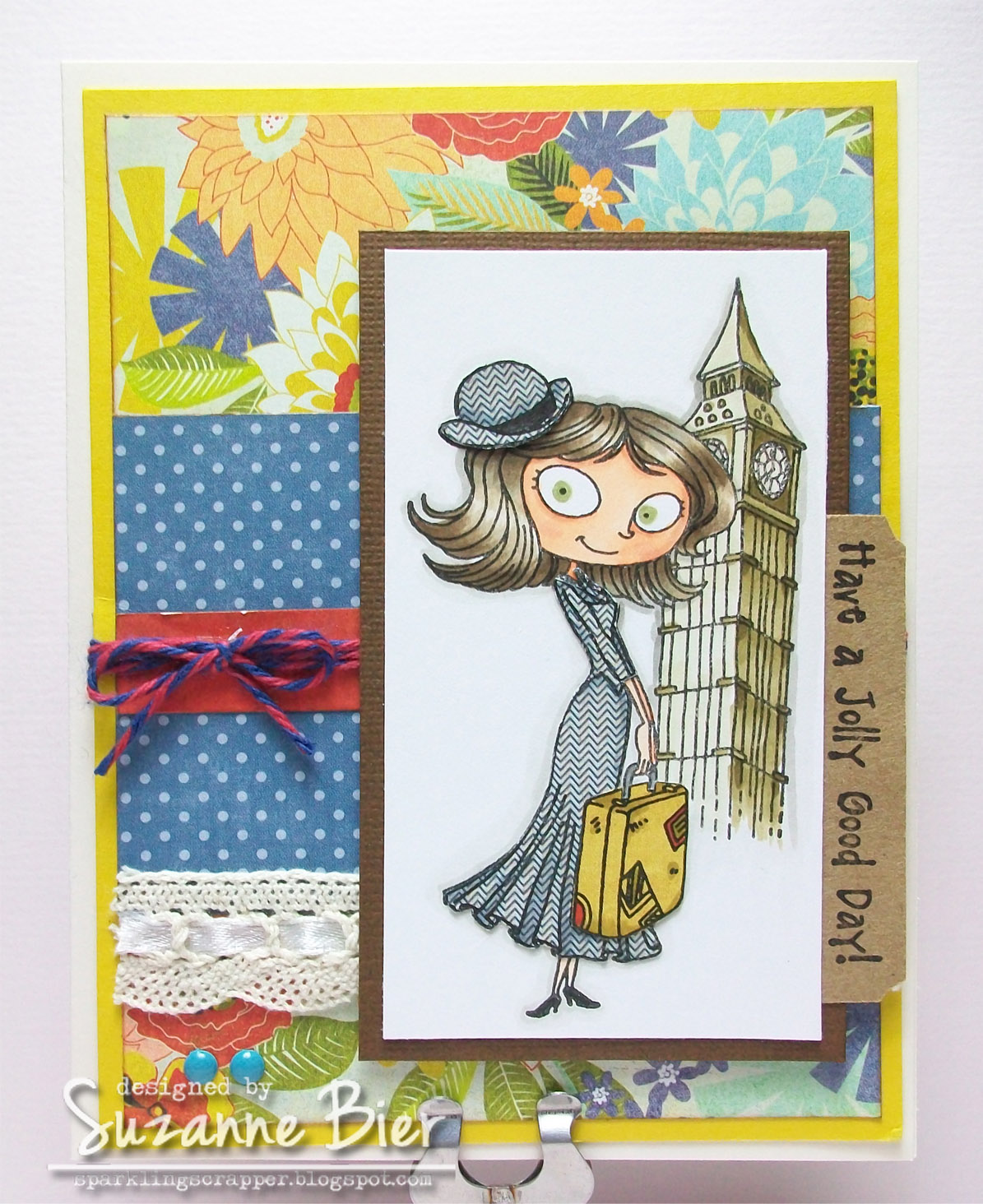 My third card is for the “Piece Out” paper piecing challenge at Kraftin’ Kimmie Stamps. I used their “Elaine” stamp set and paper pieced her hat and dress, as well as her suitcase. I added some depth with Copics on those pieces to make them more dimensional.
