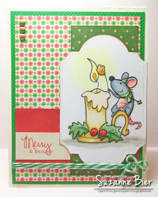 | Supplies: patterned paper (Doodlebug Design), twine (Trendy Twine), Spellbinders Labels 28, Copic markers, sentiment stamp (PaperTrey Ink – Signature Christmas), image stamp (Your Next Stamp – Merry Mouse Candle), brads, ink (Stampin Up – Real Red, Brilliance Graphite Black Ink). |