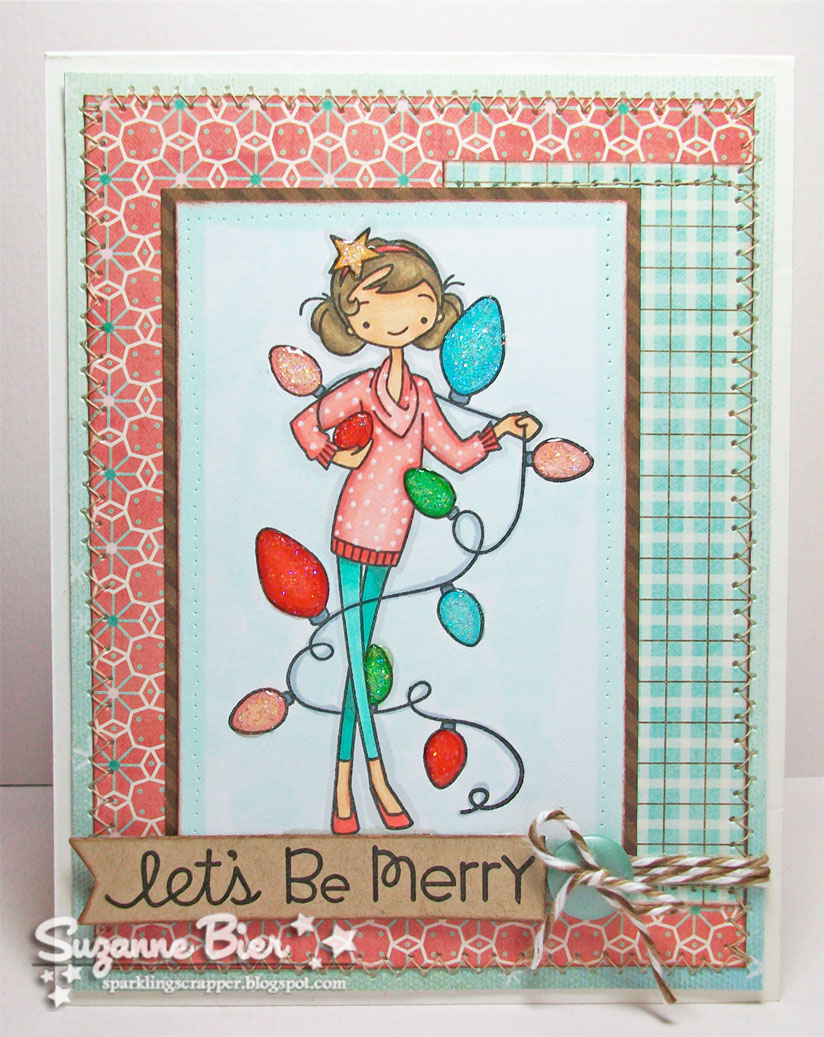 | supplies: image stamp (“You Shine” by My Favorite Things), sentiment stamp (“Christmas Sampler” by Paper Smooches), paper (“Berry Melody” by SEI), twine (Trendy Twine), button, sewing machine, Copic markers, Stickles, Glossy Accents, Copic Spica glitter pen, Brilliance Graphite Black ink. |