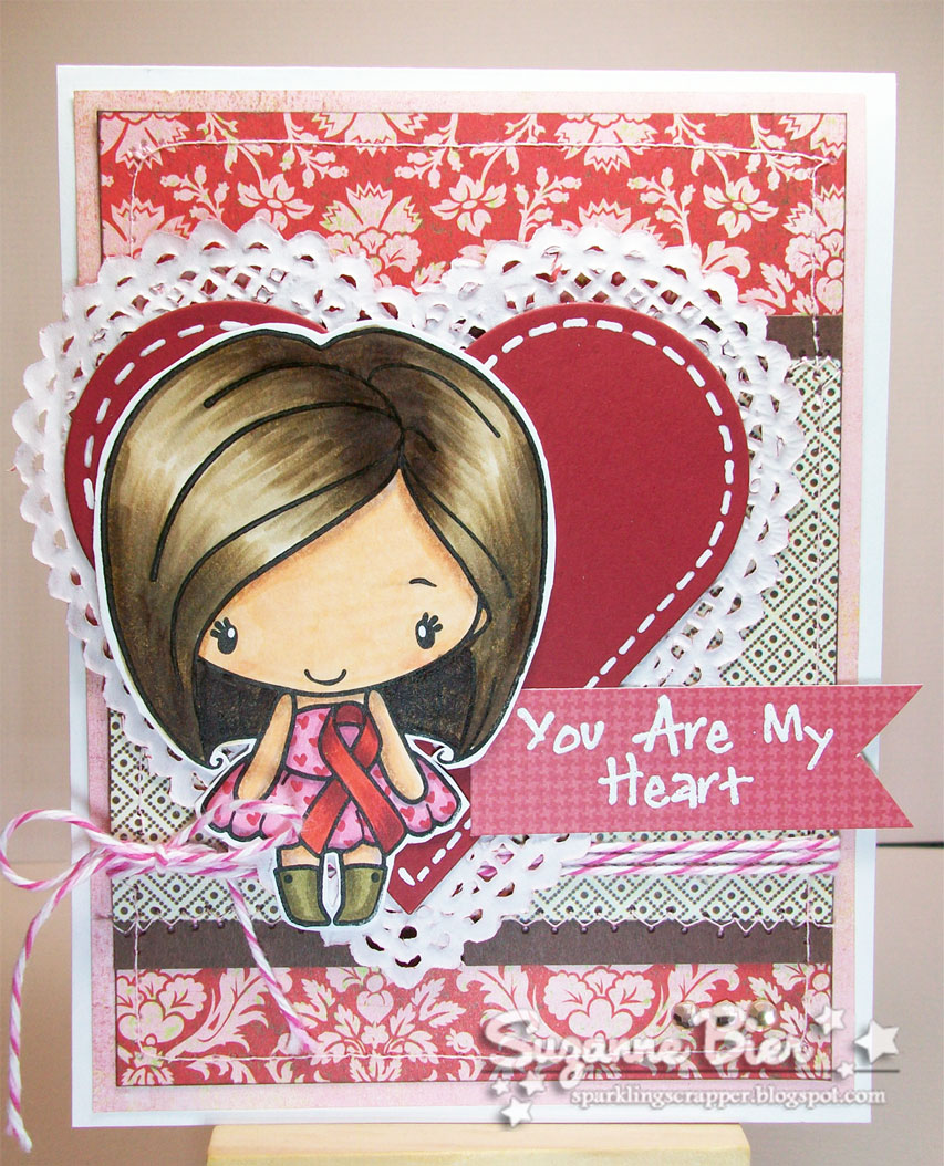 I chose to feature “Awareness Anya” again this week! For this challenge, I’m pairing her with a classic heart die and a sentiment from TGF’s “Lovey Dovey” set. This combo would work for a Valentine’s card, a general love card, or to send some words of encouragement to someone battling heart disease.