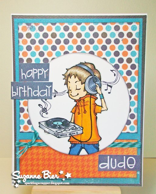 Here’s my card! I used one of my favorite guy images, “Turntable Josh” by Sparkle Creations Rubber Stamps: